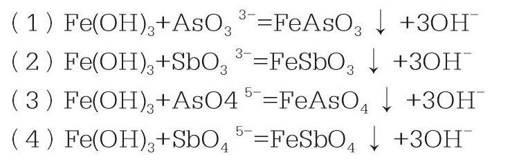 三價(jià)銻和五價(jià)銻在弱酸性至中性介質(zhì)中易水解沉淀[2], 銻酸鹽和砷酸鹽能夠與氫氧化鐵反應(yīng)生成不溶于水的沉淀物, 同時(shí)膠態(tài)氫氧化鐵具有吸附作用, 能使細(xì)小顆粒的銻、砷等硫化物和氧化物一起沉淀。主要反應(yīng)如下[3]: