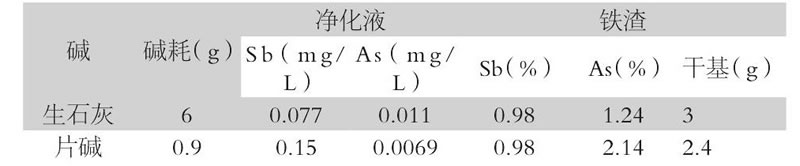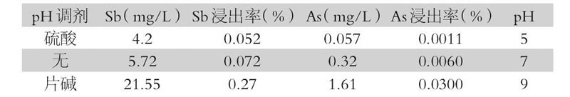 分別稱100g鐵渣 (含銻2.39%, 含砷1.61%) 浸入300ml純凈水中, 加少量的硫酸和片堿調(diào)節(jié)p H, 密封常溫靜置三周后, 分析溶液中的銻砷含量, 水浸試驗(yàn)結(jié)果見表3。
